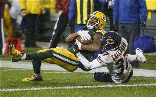 Green Bay Packers' Randall Cobb catches a pass in front of Chicago Bears' Bryce Callahan (37) during the second half of an NFL football game Thursday, Nov. 26, 2015, in Green Bay, Wis. (AP Photo/Mike Roemer) The Associated Press
