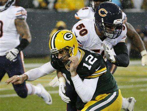 Green Bay Packers' Aaron Rodgers is hit by Chicago Bears' Shea McClellin after throwing a pass during the second half of an NFL football game Thursday, Nov. 26, 2015, in Green Bay, Wis. (AP Photo/Morry Gash) The Associated Press