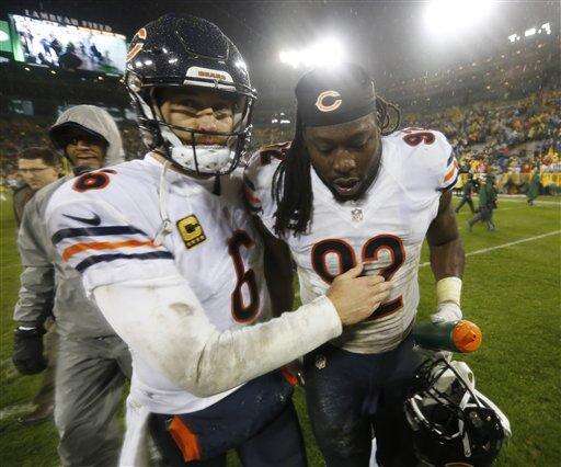 Chicago Bears' Jay Cutler (6) and Pernell McPhee (92) celebrate after an NFL football game against the Green Bay Packers Thursday, Nov. 26, 2015, in Green Bay, Wis. The Bears won 17-13. (AP Photo/Mike Roemer) The Associated Press