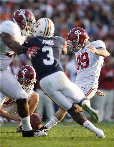 Alabama place kicker Adam Griffith (99) scores after kicking a field goal during an NCAA college football game against Auburn, Saturday, Nov. 28, 2015, in Auburn, Ala. (AP Photo/Gerald Herbert) The Associated Press