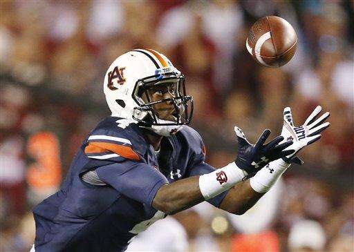 Auburn wide receiver Jason Smith (4) tips a pass to himself before scoring a touchdown during the second half of an NCAA college football game against Alabama, Saturday, Nov. 28, 2015, in Auburn, Ala. (AP Photo/Gerald Herbert) The Associated Press