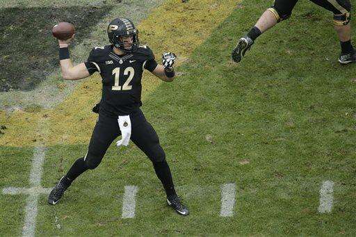Purdue quarterback Austin Appleby (12) passes whie playing Indiana during the first half of an NCAA college football game in West Lafayette, Ind., Saturday, Nov. 28, 2015. (AP Photo/AJ Mast)
