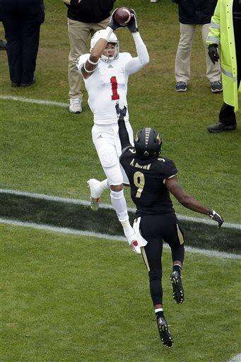 Indiana wide receiver Simmie Cobbs Jr. (1) pulls in a touchdown pass in front of Purdue cornerback Anthony Brown (9) during the first half of an NCAA college football game in West Lafayette, Ind., Saturday, Nov. 28, 2015. (AP Photo/AJ Mast)