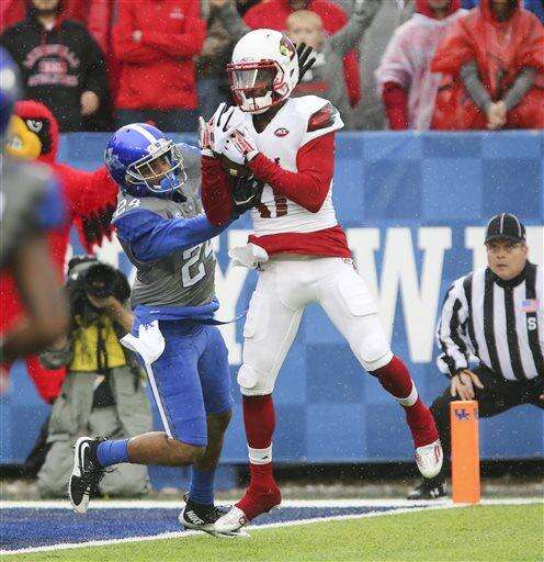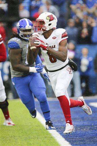 Louisville wide receiver James Quick catches a 35-yard touchdown pass in front of Kentucky cornerback Blake McClain during the second half of an NCAA college football game Saturday, Nov. 28, 2015, in Lexington, Ky. Louisville won the game 38-24. (AP Photo/David Stephenson)