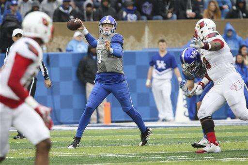 Kentucky quarterback Drew Barker throws downfield to a receiver during the first half of an NCAA college football game against Louisville, Saturday, Nov. 28, 2015, in Lexington, Ky. (AP Photo/David Stephenson)