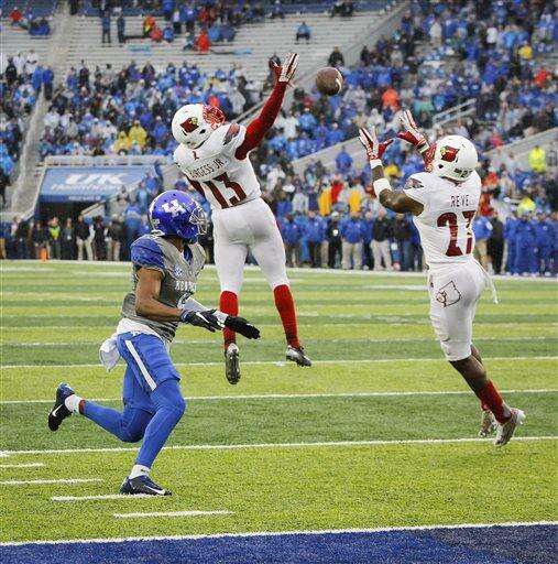 Louisville safety Jermaine Reve intercepts a pass intended for Kentucky wide receiver Garrett Johnson late in the fourth quarter to stop Kentucky's final drive in an NCAA college football game Saturday, Nov. 28, 2015, in Lexington, Ky. Louisville won the game 38-24. Louisville linebacker James Burgess (13) helps defend. (AP Photo/David Stephenson)