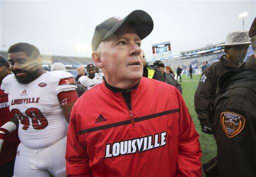 Louisville head coach Bobby Petrino leaves the field after his team defeated Kentucky 38-24 in an NCAA college football game Saturday, Nov. 28, 2015, in Lexington, Ky. (AP Photo/David Stephenson)