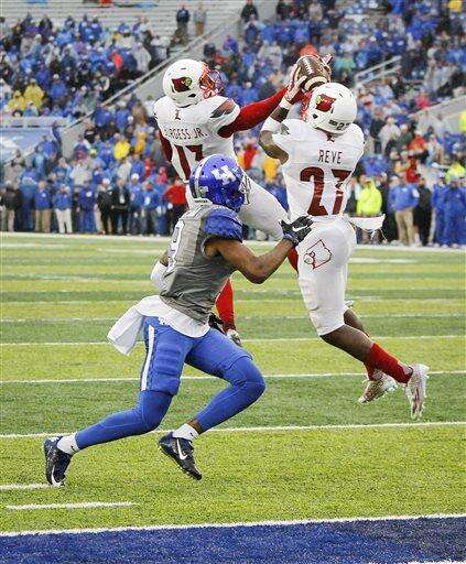 Louisville safety Jermaine Reve intercepts a pass intended for Kentucky wide receiver Garrett Johnson late in the fourth quarter to stop Kentucky's final drive of an NCAA college football game Saturday, Nov. 28, 2015, in Lexington, Ky. Louisville won the game 38-24. Louisville linebacker James Burgess (13) helps defend. (AP Photo/David Stephenson)