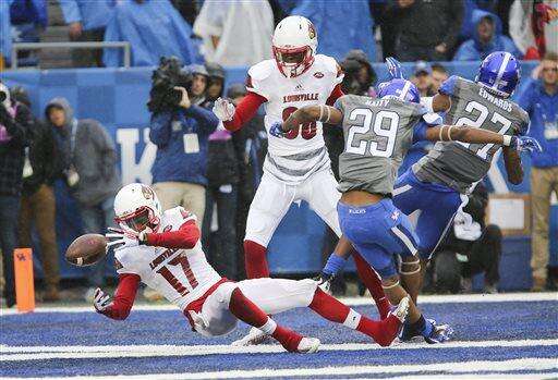 Louisville wide receiver James Quick falls to the ground and drops a pass in the end zone after colliding with Kentucky defensive back Derrick Baity during the second half of an NCAA college football game Saturday, Nov. 28, 2015, in Lexington, Ky. Louisville won the game 38-24. Both were injured on the play but walked off the field. (AP Photo/David Stephenson)