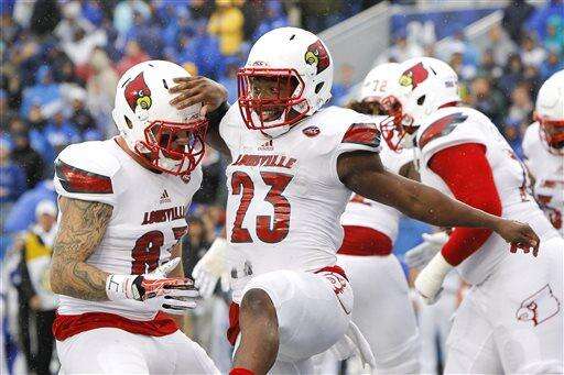 Louisville running back Brandon Radcliff, center, celebrates with tight end Micky Crum, left, after scoring on a 6-yard run during the second half of an NCAA college football game against Kentucky, Saturday, Nov. 28, 2015, in Lexington, Ky. Louisville won the game 38-24. (AP Photo/David Stephenson)