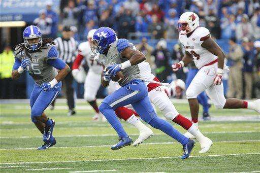 Kentucky safety A.J. Stamps returns an interception during the first half of an NCAA college football game against Louisville, Saturday, Nov. 28, 2015, in Lexington, Ky. (AP Photo/David Stephenson)