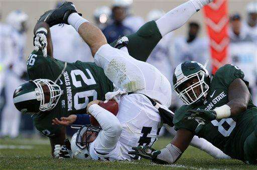Penn State quarterback Christian Hackenberg, center, is sacked by Michigan State's Joel Heath (92) and Lawrence Thomas, right, during the second quarter of an NCAA college football game, Saturday, Nov. 28, 2015, in East Lansing, Mich. (AP Photo/Al Goldis) The Associated Press