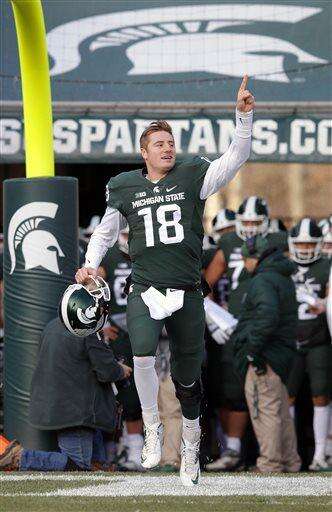 Michigan State senior quarterback Connor Cook runs onto the field as he is introduced before an NCAA college football game against Penn State, Saturday, Nov. 28, 2015, in East Lansing, Mich. (AP Photo/Al Goldis) The Associated Press