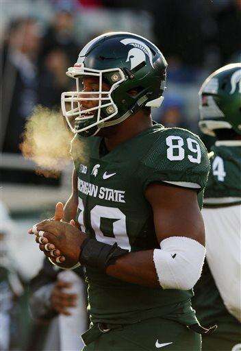 Michigan State's Shilque Calhoun warms up before an NCAA college football game against Penn State, Saturday, Nov. 28, 2015, in East Lansing, Mich. (AP Photo/Al Goldis) The Associated Press
