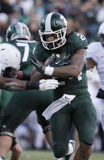 Michigan State's Gerald Holmes runs for a touchdown against Penn State's Jason Cabinda, left, during the second quarter of an NCAA college football game, Saturday, Nov. 28, 2015, in East Lansing, Mich. (AP Photo/Al Goldis) The Associated Press