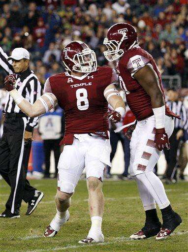 Temple linebacker Tyler Matakevich (8) celebrates his sack with defensive lineman Praise Martin-Oguike (50) during the first half of an NCAA college football game against the Connecticut, Saturday, Nov. 28, 2015, in Philadelphia. (AP Photo/Chris Szagola) The Associated Press