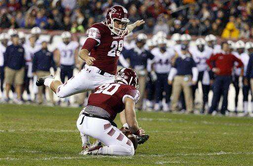 Temple place kicker Austin Jones (29) kicks a field goal as wide receiver Tom Bradway (20) holds during the first half of an NCAA college football game against the Connecticut, Saturday, Nov. 28, 2015, in Philadelphia. (AP Photo/Chris Szagola) The Associated Press