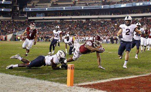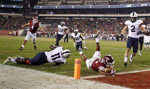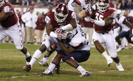 Temple running back Jahad Thomas, center, dives for the touchdown as Connecticut linebacker Junior Joseph, left, tries to stop him with linebacker Graham Stewart, right, during the first half of an NCAA college football game, Saturday, Nov. 28, 2015, in Philadelphia. (AP Photo/Chris Szagola) The Associated Press