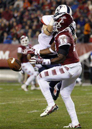 Temple wide receiver Brandon Shippen, right, is unable to catch a pass as he was interfered with by Connecticut safety Ellis Marder, left, during the first half of an NCAA college football game, Saturday, Nov. 28, 2015, in Philadelphia. (AP Photo/Chris Szagola) The Associated Press
