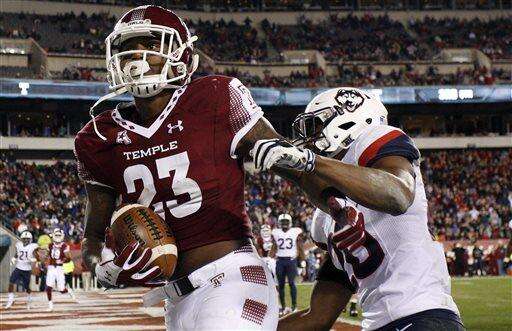 Temple wide receiver Romond Deloatch (23) reacts to his touchdown catch over Connecticut safety Obi Melifonwu (20) during the second half of an NCAA college football game, Saturday, Nov. 28, 2015, in Philadelphia. (AP Photo/Chris Szagola) The Associated Press
