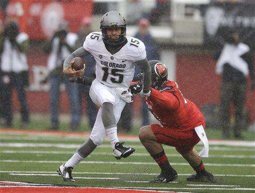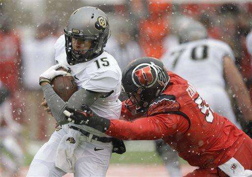 Utah defensive end Jason Fanaika, right, reaches for Colorado quarterback Cade Apsay (15) as he carries the ball in the first half during an NCAA college football game Saturday, Nov. 28, 2015, in Salt Lake City. (AP Photo/Rick Bowmer) The Associated Press