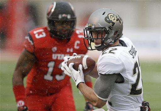 Colorado wide receiver Nelson Spruce (22) turns upfield after catching a pass against Utah in the first half during an NCAA college football game Saturday, Nov. 28, 2015, in Salt Lake City. (AP Photo/Rick Bowmer) The Associated Press