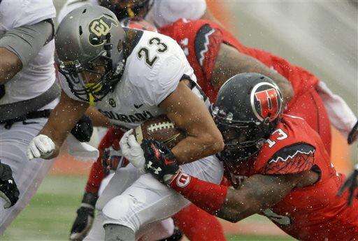 Utah linebacker Gionni Paul (13) tackles Colorado running back Phillip Lindsay (23) in the first quarter during an NCAA college football game Saturday, Nov. 28, 2015, in Salt Lake City. (AP Photo/Rick Bowmer) The Associated Press