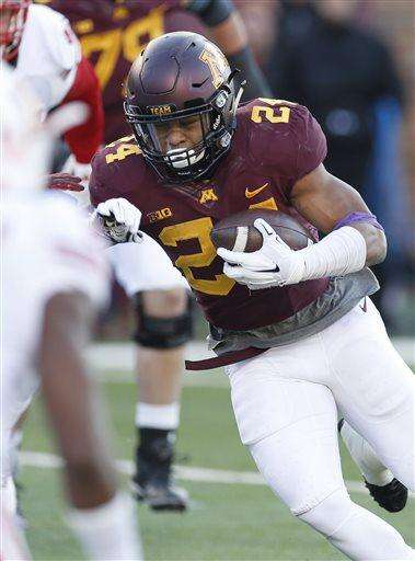 Minnesota running back Rodney Smith (24) runs to the end zone to score against Wisconsin in the first half of an NCAA college football game, Saturday, Nov. 28, 2015, in Minneapolis. (AP Photo/Jim Mone) The Associated Press
