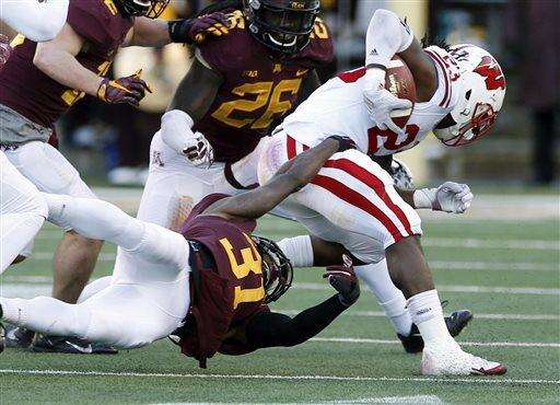 Wisconsin running back Dare Ogunbowale, right, tries to break free of Minnesota defensive back Eric Murray (31) in the first half of an NCAA college football game, Saturday, Nov. 28, 2015, in Minneapolis. (AP Photo/Jim Mone) The Associated Press