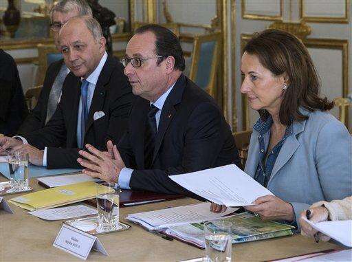 French President Francois Hollande, center, his Foreign Affairs Minister Laurent Fabius, left, and Ecology Minister Segolene Royal meet with representatives of NGOs specialized in environmental issue at the Elysee Palace in Paris, Saturday, Nov. 28, 2015. French President Francois Hollande was meeting with environmental groups Saturday, pushing for an ambitious global deal to reduce man-made emissions blamed for global warming. (Etienne Laurent/Pool Photo via AP)