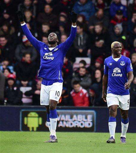 Everton's Romelu Lukaku of Belgium, celebrates scoring the second goal during the English Premier League soccer match at Vitality Stadium in Bournemouth, England, Saturday Nov. 28, 2015. (Adam Davy / PA via AP) UNITED KINGDOM OUT - NO SALES - NO ARCHIVES The Associated Press