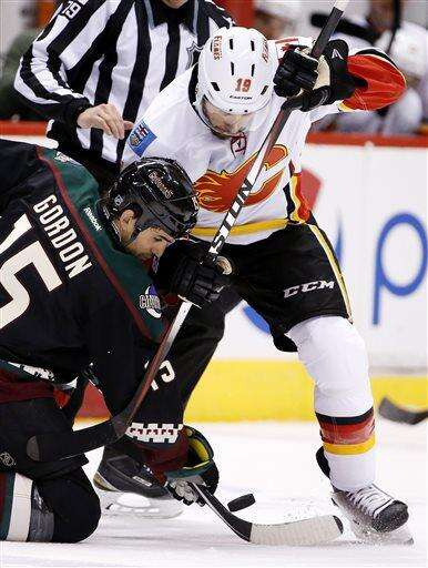 Arizona Coyotes' Boyd Gordon, left, battles Calgary Flames' David Jones, right, on a face off during the first period of an NHL hockey game Friday, Nov. 27, 2015, in Glendale, Ariz. (AP Photo/Ross D. Franklin) The Associated Press