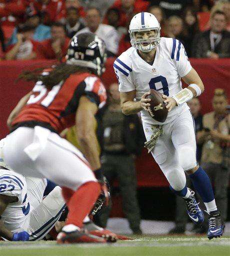 FILE - In this photo taken on Sunday, Nov. 22, 2015, Indianapolis Colts quarterback Matt Hasselbeck (8) runs out of the pocket against the Atlanta Falcons during the first of an NFL football game, in Atlanta. Hasselbeck still plays young. The 40-year-old quarterback has won all three of his starts this season, kept the Colts in contention for a third straight AFC South title, and still enjoys life in the NFL. The Colts will play against the Buccaneers Sunday, Nov. 29, where Hasselbeck and 21-year-old rookie Jameis Winston will both try to prove age doesn’t matter. (AP Photo/David Goldman, File) The Associated Press