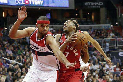 Washington Wizards guard Jared Dudley (1) fouls Toronto Raptors guard Kyle Lowry (7) in the first half of an NBA basketball game, Saturday, Nov. 28, 2015, in Washington. (AP Photo/Alex Brandon) The Associated Press