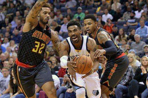 Memphis Grizzlies guard Mike Conley, center, drives between Atlanta Hawks forwards Mike Scott (32) and Kent Bazemore, right, in the first half of an NBA basketball game Friday, Nov. 27, 2015, in Memphis, Tenn. (AP Photo/Brandon Dill) The Associated Press