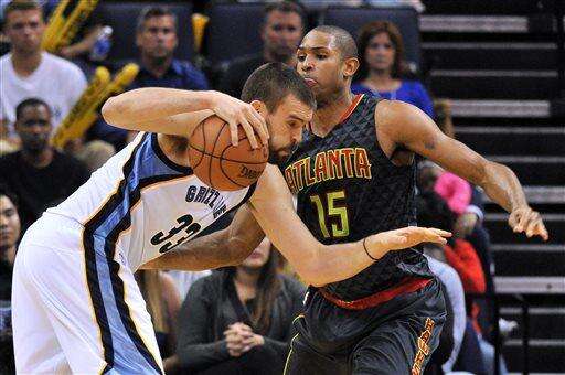 Memphis Grizzlies center Marc Gasol (33) drives against Atlanta Hawks center Al Horford (15) in the second half of an NBA basketball game Friday, Nov. 27, 2015, in Memphis, Tenn. (AP Photo/Brandon Dill) The Associated Press