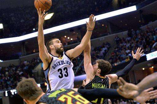 Memphis Grizzlies center Marc Gasol (33) shoots against Atlanta Hawks forward Mike Muscala, right, in the first half of an NBA basketball game Friday, Nov. 27, 2015, in Memphis, Tenn. (AP Photo/Brandon Dill) The Associated Press