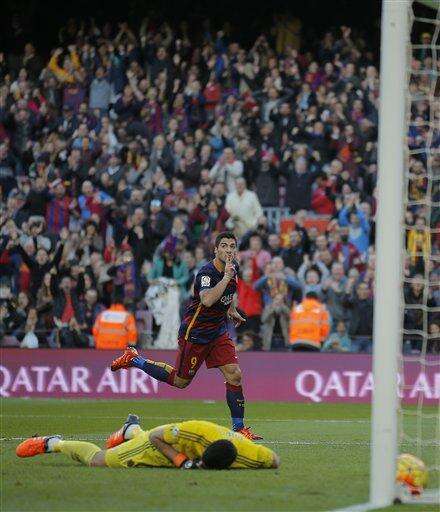 FC Barcelona's Luis Suarez, left, reacts after scoring against Real Sociedad during a Spanish La Liga soccer match at the Camp Nou stadium in Barcelona, Spain, Saturday, Nov. 28, 2015. (AP Photo/Manu Fernandez) The Associated Press
