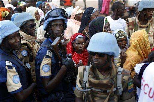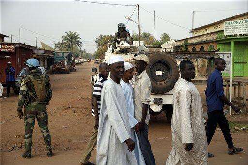 U.N. peacekeeping soldiers guard the streets around at Bangui's Koudoukou mosque, Central African Republic, prior to the arrival of Pope Francis for a meeting with the Muslim community, Monday, Nov. 30, 2015. Pope Francis is in Africa for a six-day visit that is taking him to Kenya, Uganda and the Central African Republic. (AP Photo/Andrew Medichini)