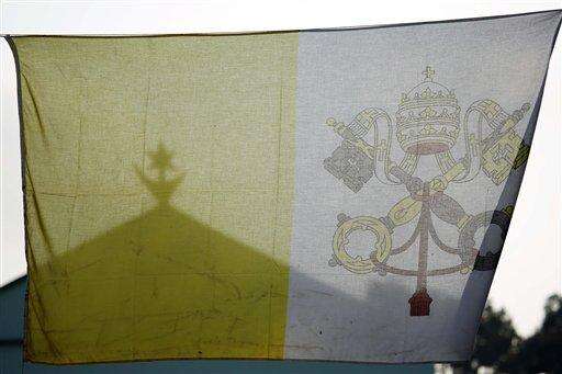 A Vatican flag frames the Central Mosque on the occasion of Pope Francis visit in Bangui's Muslim enclave of PK5, Central African Republic, Monday Nov. 30, 2015. The Pope was welcomed by a crowd of people and prayed inside the Central Mosque. (AP Photo/Jerome Delay)