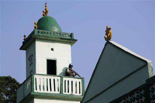 A UN soldier stands guard on the top of Central Mosque on the occasion of Pope Francis visit in Bangui's Muslim enclave of PK5, Central African Republic, Monday Nov. 30, 2015. The Pope was welcomed by a crowd of people and prayed inside the Central Mosque. (AP Photo/Jerome Delay)