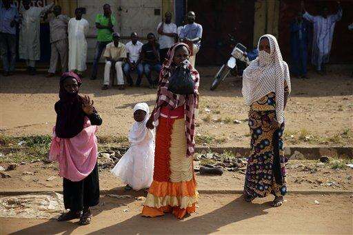 People stand in the streets around Bangui's Koudoukou mosque, Central African Republic, during Pope Francis's meeting with the Muslim community, Monday, Nov. 30, 2015. Pope Francis is in Africa for a six-day visit that is taking him to Kenya, Uganda and the Central African Republic. (AP Photo/Andrew Medichini)