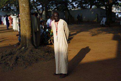 A man waits for the arrival of Pope Francis on the occasion of his visit at the Central Mosque in Bangui's Muslim enclave of PK5, Central African Republic, Monday Nov. 30, 2015. The Pope was welcomed by a crowd of people and prayed inside the Central Mosque. (AP Photo/Jerome Delay)