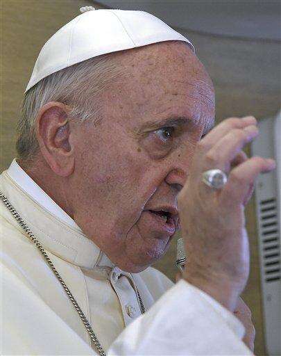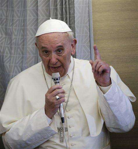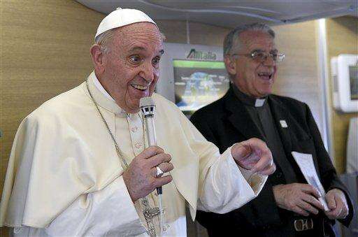 Pope Francis talks to journalists during a press conference he held aboard the flight on the way back to the Italy, Monday, Nov. 30, 2015. Pope Francis traveled to Africa for a six-day visit that took him to Kenya, Uganda and the Central African Republic. (AP Photo/Andrew Medichini)