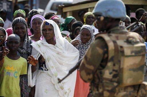 UN soldiers stand near Muslims faithful queuing to enter the Central Mosque on the occasion of Pope Francis visit in Bangui's Muslim enclave of PK5, Central African Republic, Monday Nov. 30, 2015. The Pope was welcomed by a crowd of people and prayed inside the Central Mosque. (AP Photo/Jerome Delay)