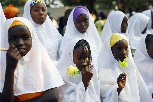 Children wait for the arrival of Pope Francis on the occasion of his visit at the Central Mosque in Bangui's Muslim enclave of PK5, Central African Republic, Monday Nov. 30, 2015. The Pope was welcomed by a crowd of people and prayed inside the Central Mosque. (AP Photo/Jerome Delay)