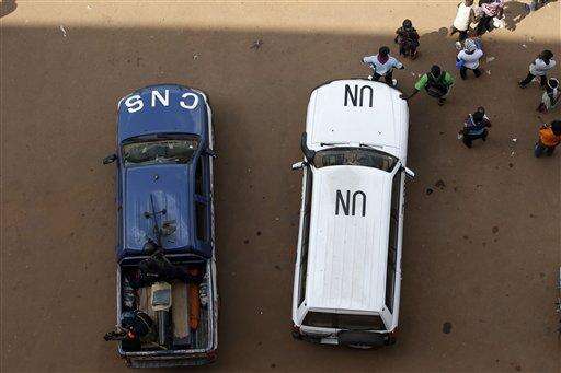 A police and a U.N. vehicles enforce security outside the Barthelemy Boganda Stadium, in Bangui, Central African Republic, as Pope Francis celebrates mass, Monday, Nov. 30, 2015. Pope Francis is in Africa for a six-day visit that is taking him to Kenya, Uganda and the Central African Republic. (AP Photo/Andrew Medichini)