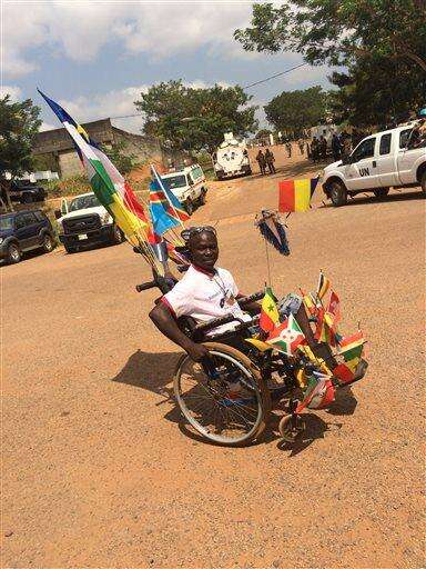 Stanislas Redepouzou, 28, brings his wheelchair to a stop after getting a blessing from Pope Francis in the Bangui, Central African Republic sports stadium on Monday, Nov. 30, 2015. Redepouzou said he lost his right leg to a grenade attack by Muslim militants in December 2013 but was ready to heed Francis' call for reconciliation. (AP Photo/Nicole Winfield)
