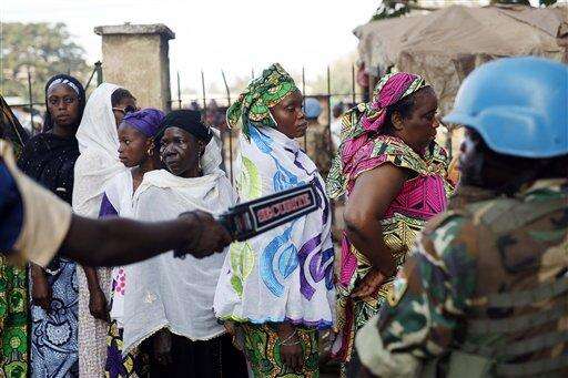 Faithful queuing to enter the Central Mosque wait to pass security checks performed by UN soldiers on the occasion of Pope Francis visit in Bangui's Muslim enclave of PK5, Central African Republic, Monday Nov. 30, 2015. The Pope was welcomed by a crowd of people and prayed inside the Central Mosque. (AP Photo/Jerome Delay)