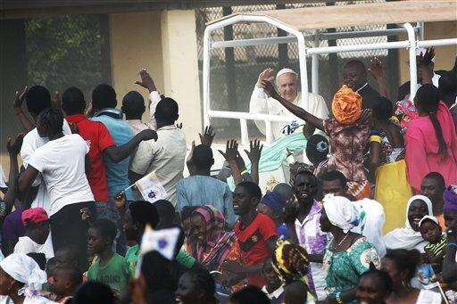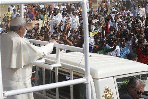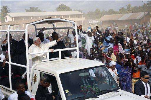 Pope Francis waves to the crowd as he arrives with the popemobile on the occasion of his visit at the Central Mosque in Bangui's Muslim enclave of PK5, Central African Republic, Monday Nov. 30, 2015. The Pope was welcomed by a crowd of people and prayed inside the Central Mosque. (AP Photo/Jerome Delay)